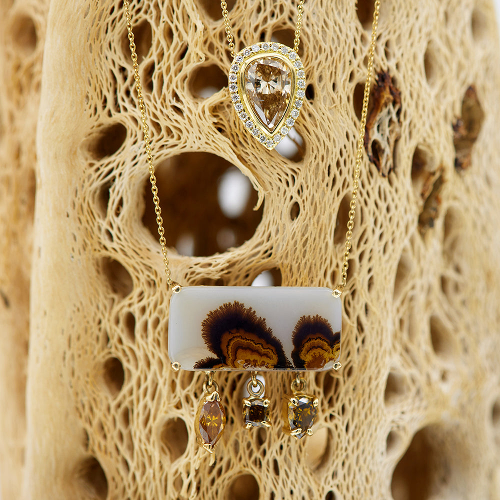 From our Galaxy collection. A dreamy necklace with natural picture (dendritic) agate, three dangle natural color diamonds in mix colors and shapes, set in 18k yellow gold.